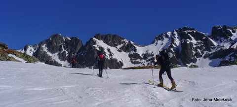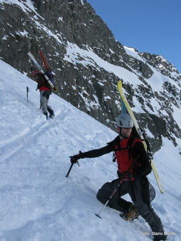 Túru sme naplánovali na štyri dni (chceme pohodu a nie naháňanie). So sebou máme len najnutnejšie veci, veď sa chystáme prenocovať i stravovať na chatách, a tak batohy nemáme veľké. Len Boco to nejako neodhadol a nabalil si plný batoh "žrádla" - neskôr sme si jeho potraviny kamarátsky podelili a aj zjedli. Ráno vyrážame z chaty smerom do Baranieho sedla, je tvrdo až "betónovo". Ešte pred "fľaškou" si obúvame mačky a lyže dávame na batoh, lebo aj mačky majú čo robiť. Najstrmšie úseky prekonávame na mačkách, ale ako sa terén trochu pokladá, znovu dávame na nohy lyže (ale tiež so stúpacími hrotmi), je to predsa len ľahšie. Aj do Baranieho sedla stúpame na mačkách, hore v sedle sme okolo jedenástej. Paráda - je pekne, kocháme sa tatranskou scenériou, ktorá nás vždy očarí, aj keď ju už za tie roky dokonale poznáme. O chvíľu si už vychutnávame jazdu na takmer firnovom snehu až dolu k Térynke. Po krátkom občerstvení na chate znovu obúvame lyže a stúpame smerom k Priečnemu sedlu. Ide sa nám dobre, nenáhlime sa, však náš dnešný cieľ Zbojnička je tu "za rohom". Z Priečneho sedla lyžujeme cez Strelecké polia vľavo popod Žltú vežu na Vyšnú Starolesniansku lúku. Parádna lyžovačka, ešte výstup na chatu a prvý deň máme za sebou. Zatiaľ je to pohodička (10km, stúpanie +1570m, klesanie -1100m), možno až príliš veľká, ale čaká nás toho ešte dosť a tak si šetríme sily.